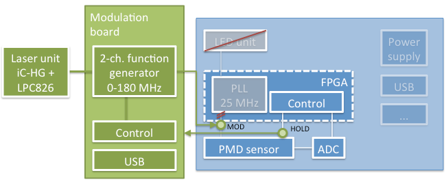 None of the systems can be used to capture transient images as they come off the shelf; either because the hardware doesn't allow it or because the API is locked down. Solutions range from (1) asking your favorite contact at Microsoft to measure data for you via (2) hacking existing hardware/software to do what you need to (3) developing the whole system from scratch. Given the current situation regarding off-the-shelf products, solution (3) would be the cleanest if you invest an EE staff for a year or so, full-time. We opted for (2) and implemented it in a modular way. Our camera, based on the PMD CamBoard nano, also contains the signal generator that produces modulation signals for sensor and light source. Our light source is a bank of laser diodes with inputs for RF modulation (BNC/50 Ohm), power and trigger signal. Recreating our systemStatus quo and solution approachThe CamBoard nano is a reference design for the PMD 19k-S3 ToF sensor that runs off the USB port and is reasonably affordable. Unfortunately, it can't do some of the things we need for transient imaging. We need to be able to change the modulation frequency, and we need to set arbitrary relative phases between illumination and reference modulation signal. The nano modulates at a fixed 25MHz (way too slow) and takes phase images in 90° steps (way too coarse). Even if we had access to its FPGA to change the modulation frequency and phase, the LED would still cut off at around 25MHz (above which the modulation contrast goes down).