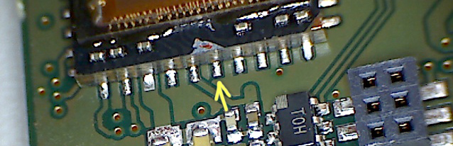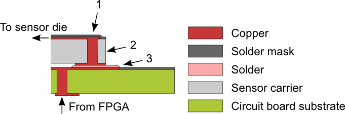 Modifying the CamBoard nanoIf the above wasn't tricky enough for you, this is the chapter where you can show what you've got. We start by removing the CamBoard from its aluminum mount using the Torx drivers. Clip off the USB cable using side cutters (before you do, take note of wire colors), and unconnect the LED from the flex board extension. By default, the nano comes with a board lens that is glued on. Carefully soften glue with a heat gun; gently pull off lens. To remove residual glue, repeat heating and scrape off with a wooden toothpick until the sensor is clean on all sides. Yes, this is as little fun as it sounds. Now take a closer look at the sensor from the "north" side, as seen above. You will find that it is in itself a printed circuit board with the silicon die sitting inside a recessed area and covered by a IR-pass window. (The tiny capacitors probably serve to filter some of the supply voltages.) You can see that most pads of the package are connected to the top through tiny vertical connections, so-called vias. Pin 1, the modulation line, is marked with an arrow. The drawing above illustrates a cut through sensor package (top) and CamBoard circuit board (bottom) at Pin 1 of the sensor. Red(dish) parts are conductive and carry the modulation signal from the source through the solder pad of pin 1 (3) and a via (2) to the top of the package (1). Points 1-3 are the only ones where the signal can be reached; it is covered by sensor and FPGA elsewhere. Use the cutter knife to carefully scratch off the black varnish layer above point (1), until you see the bare copper. Using the continuity tester, check that point 1 and 3 are electrically connected. Now, with a steady hand, start drilling into the package from the side (2) to interrupt the modulation line. Make sure not to go any deeper than 2mm, and stop immediately once the connection between 1 and 3 is interrupted (no more beeping from the continuity tester). ![]() ![]()